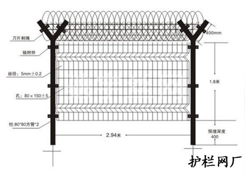 :如果在機場護欄網頂部加裝刀片刺絲、刀片刺網后又很好的增強了安全防護性能。采用電鍍、熱鍍、噴塑、浸塑等防腐形式,具有很好的抗老化、抗曬、耐腐蝕等特點。其產品造型美觀、花色多樣,既起到圍欄作用,又起到美化作用。由于具有安全性高、防攀爬能力好,網片連接方式采用特制SBS緊扣件,有效防止人為的破壞性拆卸,橫向四道折彎加強筋,使網面強度顯著增加。