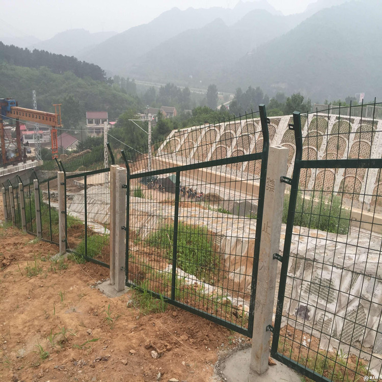 5、防腐處理:金屬網片及柵欄門的網片成形后應整體鍍鋅并進行熱浸塑(或噴塑)處理,鍍鋅量270g/m2,浸塑厚度0.8mm~ 1.2mm,顏色選用墨綠色。涂層應均勻,顏色-致,表面光滑,無流柱,滴瘤、粉泡、漏鐵等缺陷。網片制造精度要求:長度誤差≤2.5mm,高度誤≤3.0mm。網片平整度要求:凸起或凹進值≤5.0mm.冷拔鋼絲鍍鋅前直徑誤差≤0.06mm。焊接網孔誤差≤3.0mm.焊接網片連接板時,連接板焊接位置應嚴格控制在設計位置,其位置誤差≤1.5mm。矩管邊框與連接板、網片鋼絲與鋼板、網片鋼絲與矩管邊框的焊接宜采用電阻焊、如用釬焊,應選用合適的焊條,使其變形。焊接后應清理焊渣。對焊接產生的變形,應進行平整處理。為保證網片自身有足夠的強度,網片焊接點的強度應大于1KN,焊接點脫落數小于4%。