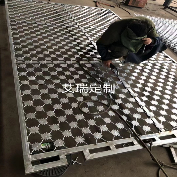 1.梅花刺片:梅花刺片直徑不小于7.0cm (直徑6cm. 7cm. 8cm ) , 刺片厚1.2mm ,采用Q235低碳鋼板沖壓成型。梅花刺片用氬弧焊將梅花刺片焊接在美格網的節點上,形成剌形保護,有效的防止了手握腳攀。