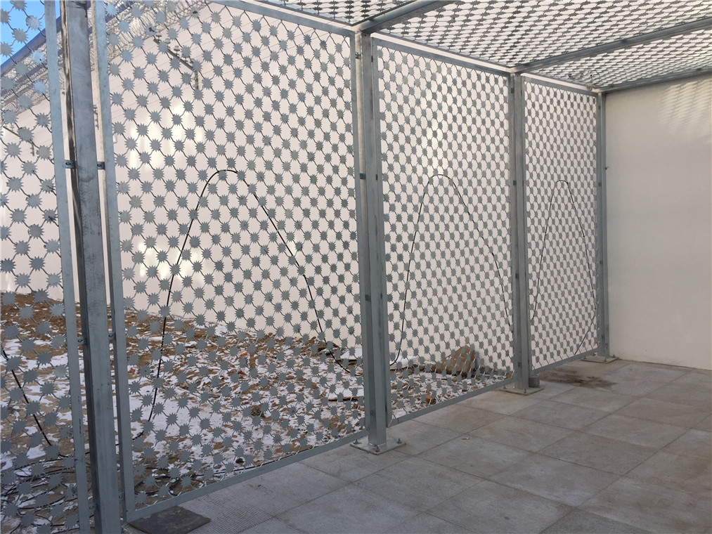 監獄梅花剌隔離網又叫沖壓剌隔離網、太陽花刺片隔離網,行業內簡稱梅花刺網。其特點為堅固牢靠、防止攀爬等。梅花刺隔離網一般用于監獄大門,探監門,人員通道兩邊的隔離網,由于其成本造價高,所以還沒有廣泛替代焊接式隔離網。下面說一下其產品規格要求。