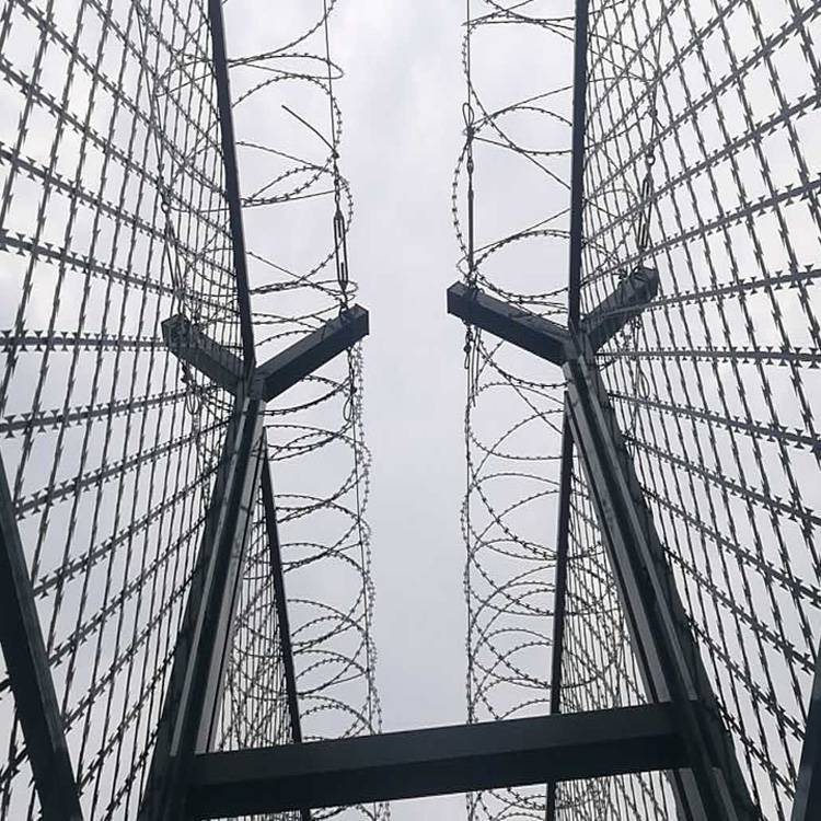 監(jiān)獄鋼網(wǎng)墻(監(jiān)獄圍墻網(wǎng))技術(shù)要求:監(jiān)獄鋼網(wǎng)是一種新型鋼網(wǎng) ,技術(shù)要求較高、隔離防護(hù)效果要強(qiáng)、不能翻越。通常采用銳利尖角鍍鋅鋼板或不銹鋼薄板做刀片,鋼絲做芯線組合而成的防護(hù)器材該產(chǎn)品具有嚇阻、防翻越等效果,材質(zhì)堅(jiān)硬,高強(qiáng)度,高張力,造型設(shè)計(jì)獨(dú)特,不宜觸摸,因而能達(dá)到極好的防護(hù)隔離效果。還具有施工簡(jiǎn)便,經(jīng)濟(jì)實(shí)用等優(yōu)點(diǎn)。1.監(jiān)獄鋼網(wǎng)墻(監(jiān)獄圍墻網(wǎng))采用方管,角鋼,刀片剌網(wǎng),鋼板網(wǎng)等鐵件采用熱鍍鋅,鍍鋅量不小于220克/m2 ,后加PVC浸塑處理,塑層厚 度0.38mm ,浸塑顏色為黑色.2.監(jiān)獄鋼網(wǎng)墻(監(jiān)獄圍墻網(wǎng))蛇腹型刀剌網(wǎng)采用熱鍍鋅加噴塑(雙層防腐)塑層厚度0.2mm.3.連接件采用螺栓熱鍍。4.門(mén)規(guī)格一般為: 1000*2000平開(kāi)門(mén)。
