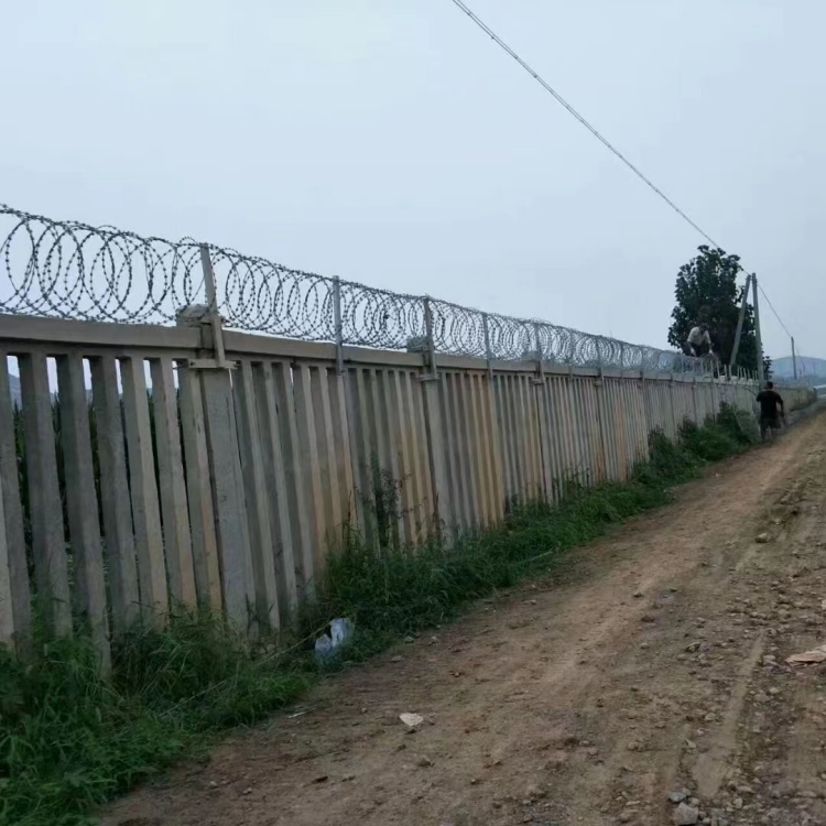 通常來說高鐵兩側應用刺絲滾籠的話會用到水泥制圍欄而刀片刺繩則是安裝到了圍欄上面防止翻越的。在設計上面不同的地形設計成了不一樣的樣式,