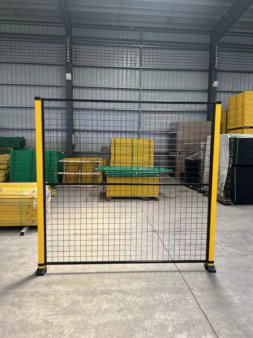 車間護欄網又稱為車間圍欄網、倉庫隔離網、隔離柵等。用來隔離貨物,圍擋機器用,用與位置主要起醒目警示的作用,多用醒目的黃色作為主打色。材質多選用低碳鋼絲,電焊或編織而成,四周配以邊框(可不選)來使用,以起到圍擋警示的作用。