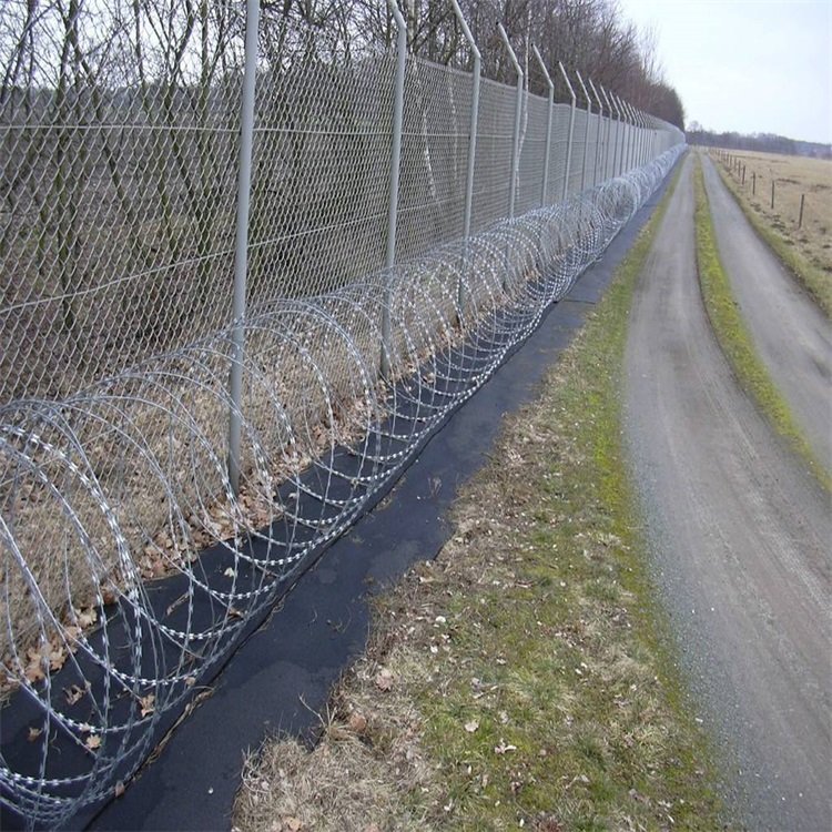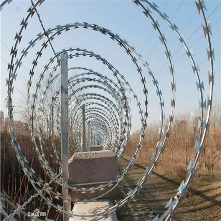 近年發展起來的防護、隔離能力較強的新型防護網產品。它采用鋼板沖壓成型包附于鋼絲之上,由銳利尖角鍍鋅鋼板或不銹鋼薄板做刀片,高張力鋼絲做芯線組合而成的。根據形狀可分為:螺旋式-刀片刺網、交叉式-刀刺網、平板式-刀片刺網、直線式-刀片刺網被廣泛應用在監獄,機場,軍事基地等高安全場所。
