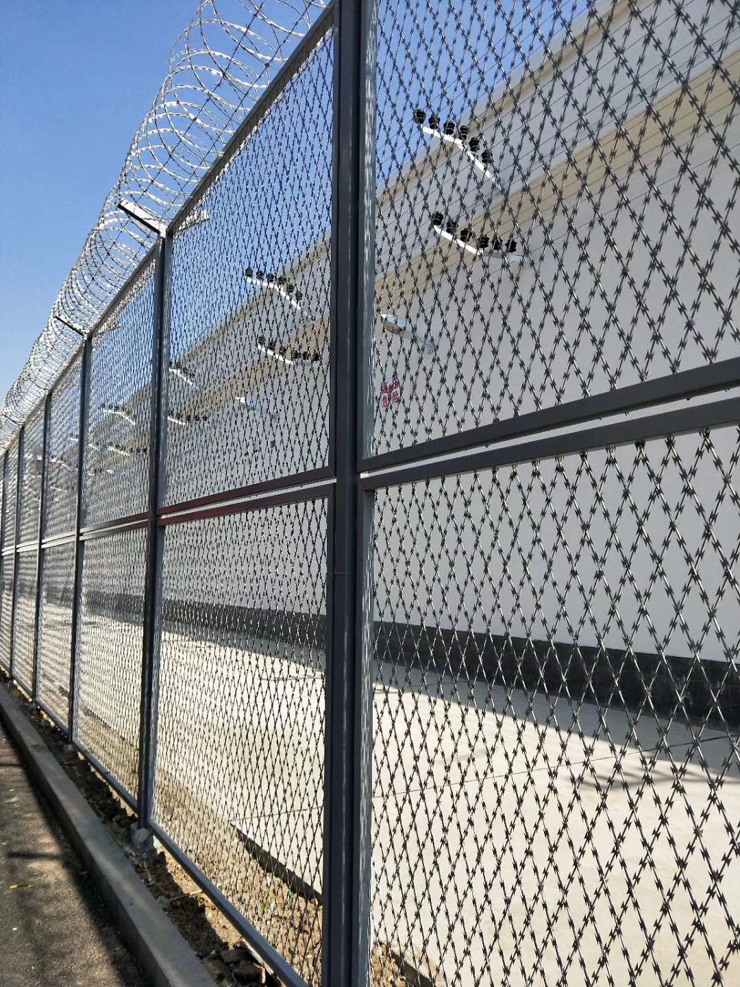 刀片剌網隔離網邊框:監獄鋼網墻的框架選用優質矩形方管或者國標角鋼制作,常用規格有 橫截面為30mm*50mm、20mm*40mm.