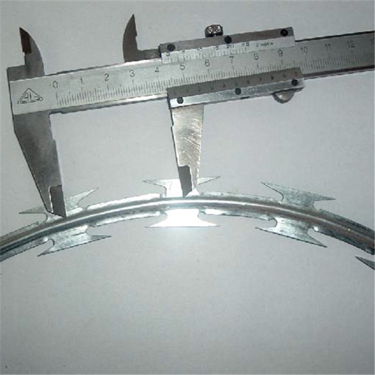 刀片刺絲又名刮刀型刺絲,是一種近年發展起來的防護、隔離能力較強的新型防護網產品。它采用鋼板沖壓成型包附于鋼絲(筋絲)之上,由銳利尖角鍍鋅鋼板或不銹鋼薄板做刀片,高張力鋼絲做芯線組合而成的。鋒利的刀型刺由雙線扣裝后成蛇腹狀,既美觀又讓人不寒而粟。起到了很好的阻嚇作用。該產品具有美觀、防阻效果好、施工便利等優點。